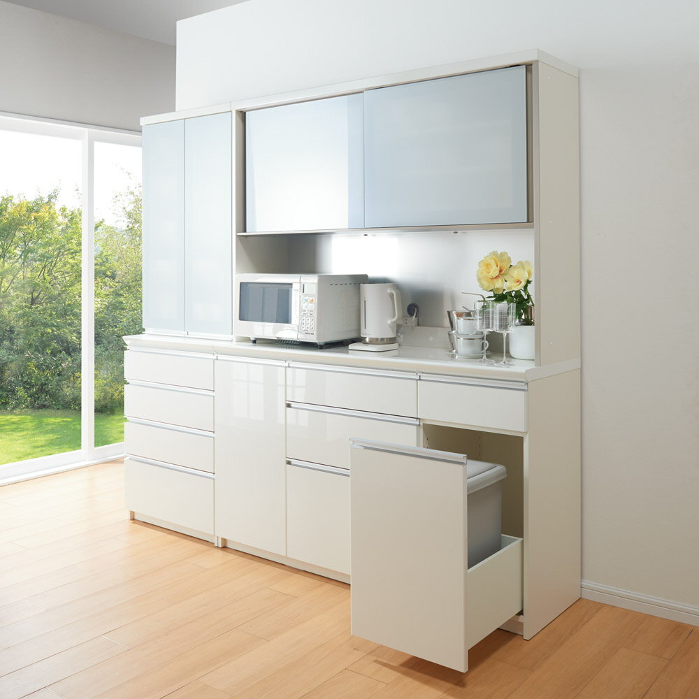 レンジボード ホワイト色 幅119.5 奥行48 高さ180 日本製 ロータイプ 引き戸 棚板可動式 レール付き引出 スライドカウンター 食器棚 シンプル キッチン収納 台所収納 ドレス インテリア 家具 送料無料 ヴィヴェンティエ