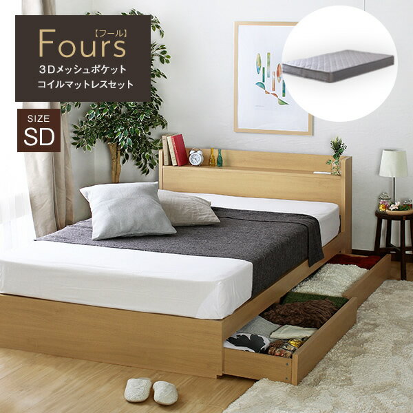 収納ベッド セミダブル ベッドフレーム シンプル 引出し コンセント付 ベッド ポケットコイル 宮棚 お洒落 マットセット おしゃれ モダン 北欧 マットレスセット Fours【フール】3Dメッシュマットレスシリーズ(SI)